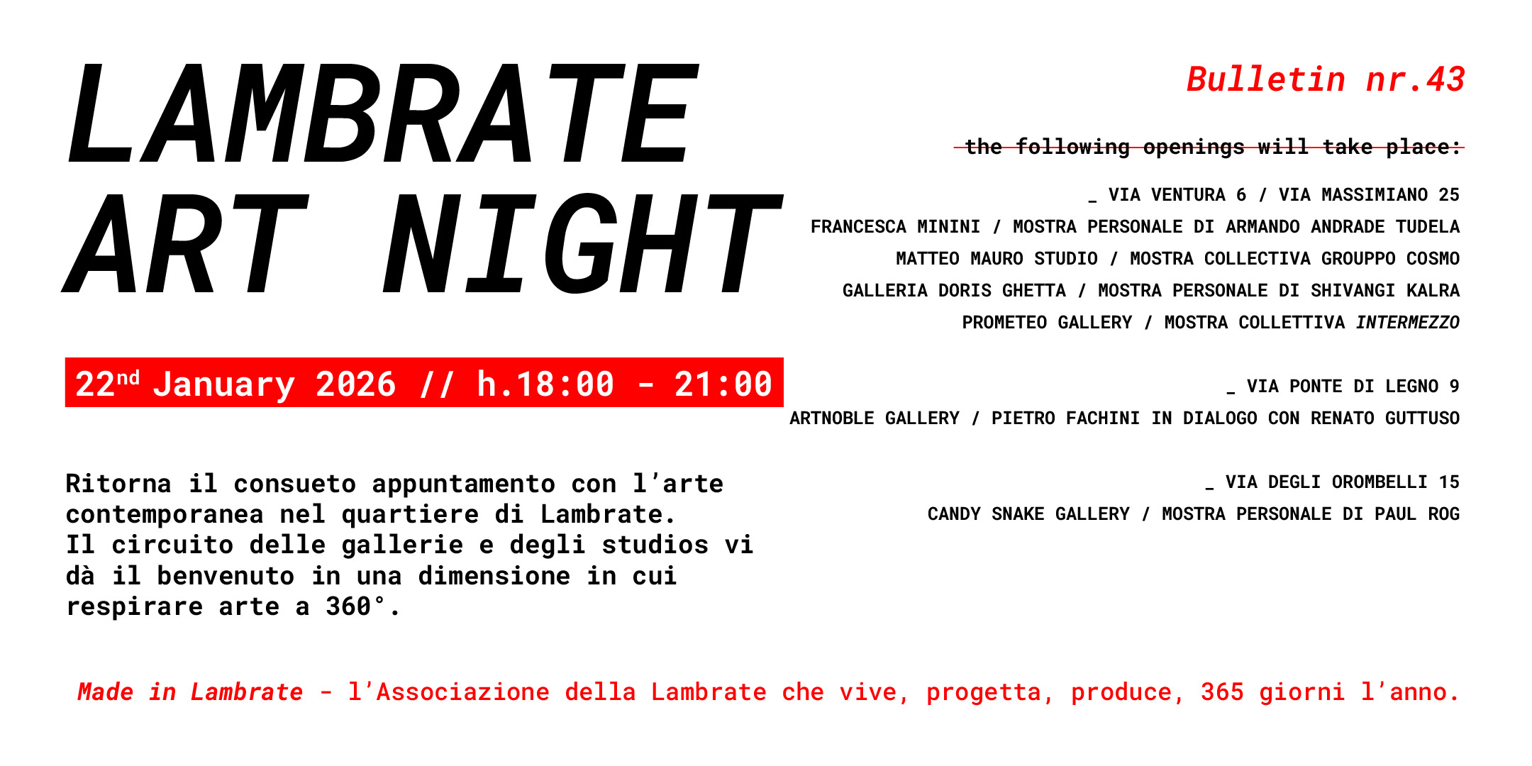 On January 22nd from 6:00 to 9:00 PM in Milan’s Lambrate art district, Lambrate Art Night bulletin Nr.43 opens the calendar year by inviting art lovers to come together and share an evening of art, gallery openings, an exchange of ideas and strengthening the community. As the first Lambrate art night of the new year this event serves to activate the contemporary art calendar. With this events participation activating across multiple galleries and art studios throughout the Lambrate neighbourhood.