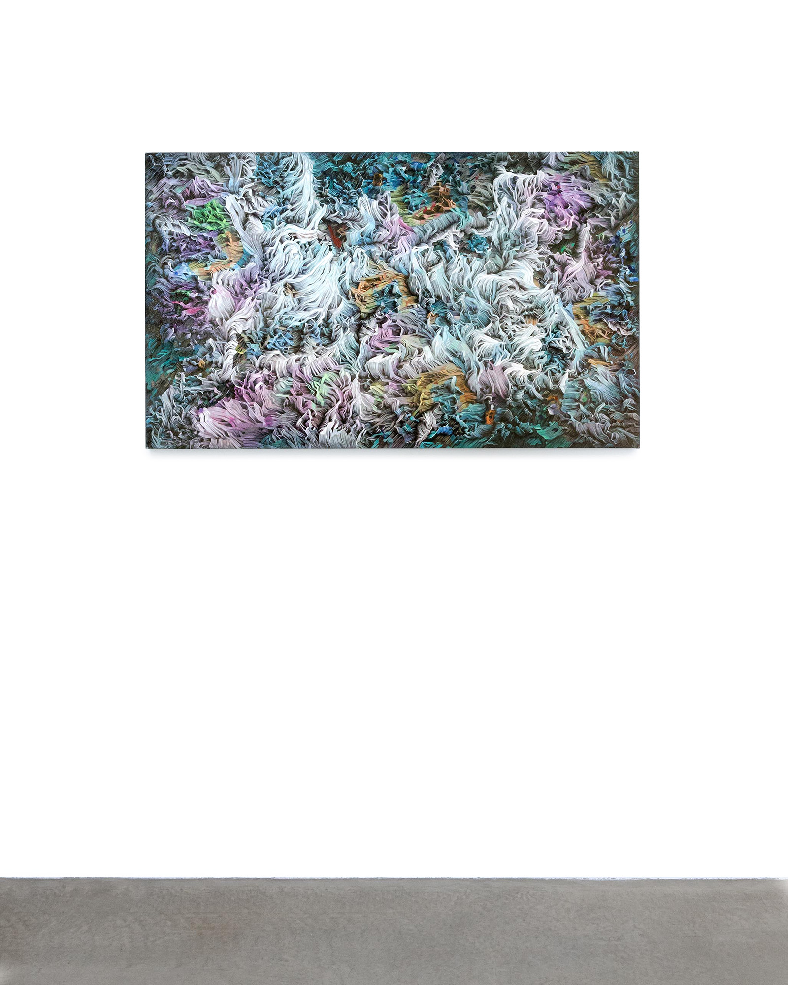 Mauro’s Inscriptions on canvas artworks are born from persistent research into engraving and digital aesthetics, the series represents a synthesis between the tactile and the computational. The two canvas artworks presented at Artissima 2025, Towards a Blue Mannerism and Baroque on Jupiter, embody the series creative tension. Exploring the harmony and theatricality of the Mannerist palette through a interpretation of blue tonality, while the other artwork expands Mauro’s dialogue with Baroque exuberance imagined through a poetic abstraction.