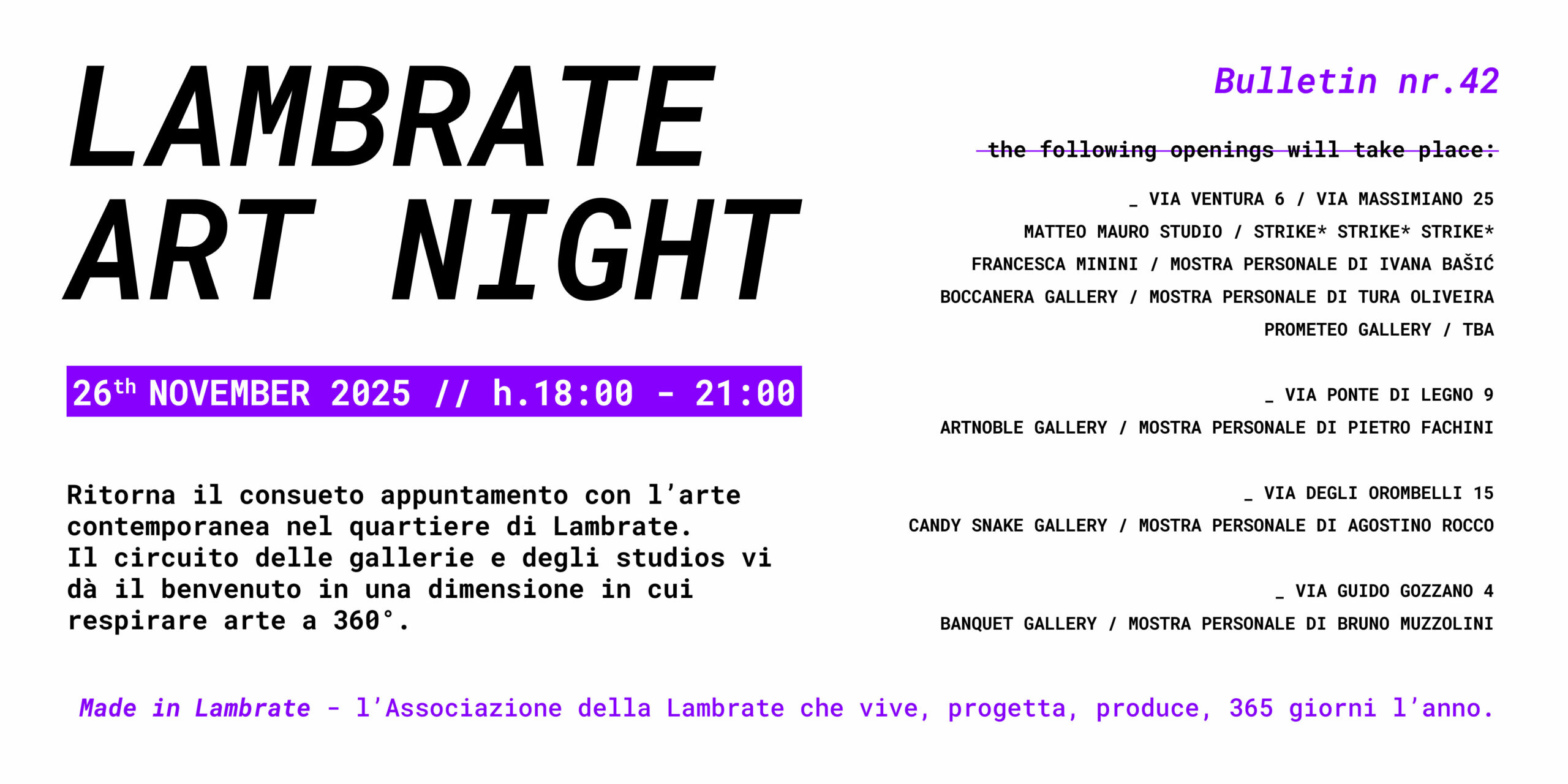 On the occasion of Open Art Night: Bulletin n. 42, Matteo Mauro will strike*, keeping its doors closed for a special evening dedicated to reflection and creative disruption. This gesture opens a dialogue about artistic discovery by stepping back rather than stepping forward. Across the vibrant art district of Via Ventura in Lambrate, visitors are invited to explore a constellation of contemporary galleries and studios united by a shared commitment to experimentation and openness.